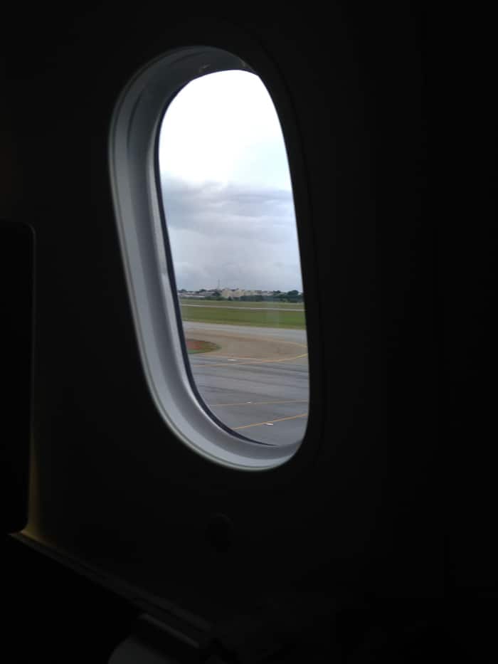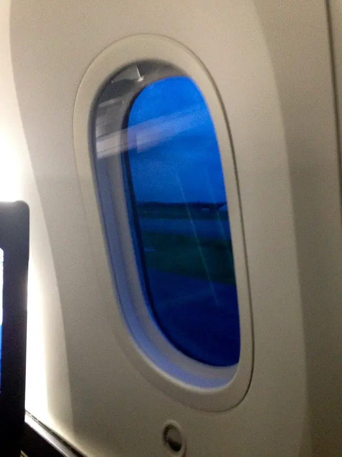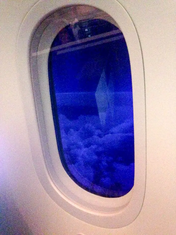 Um dos nossos assentos era de costas e foi estranho decolar assim. Tínhamos grandes expectativas em voar no 787, em especial pela janela maior, melhor qualidade do ar e menor nível de ruído. A janela maior é bacana, mas como o vôo foi noturno, não tivemos muito o que aproveitar. Quanto à qualidade do ar, não sentimos muita diferença, o barulho das turbinas era alto (estávamos bem próximos a elas) e os fones de ouvido foram usados até ao dormir!