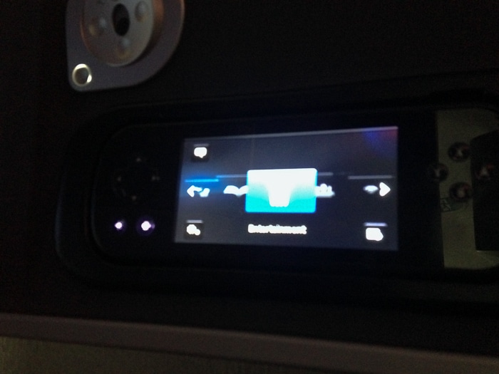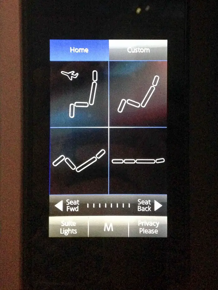 Os assentos são distribuídos em formato de espinha de peixe, 1-2-1 e todos com acesso ao corredor. Lembrando que alguns são de costas. Ao chegarmos na poltrona encontramos um kit com travesseiro e edredom, uma necessaire, fones de ouvido BOSE com cancelamento de ruído e uma garrafa de água. A poltrona oferece bastante espaço, reclina 180º, mas deixa a desejar em privacidade, pois dependendo do assento, ficamos de cara com o vizinho do outro lado do corredor. Como viajávamos com uma criança, isso foi bom para poder ficar de olho nela todo o tempo.