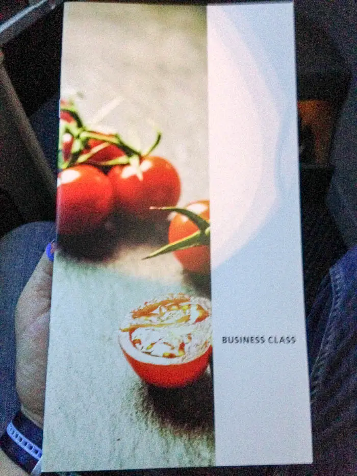 Após a decolagem o atendente pegou nossos pedidos de prato principal para a janta e logo após trouxe bebidas e um mix de nozes quentes.