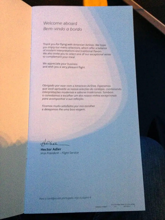 Saímos da sala VIP e nos dirigimos ao portão de embarque, um dos últimos do terminal 3 de Guarulhos. Quando chegamos lá o embarque já havia iniciado, mas ao mostrarmos nossos cartões de embarque fomos direcionados ao acesso prioritário. Na porta do avião nos direcionaram aos nossos assentos (2A, 2D e 2H).