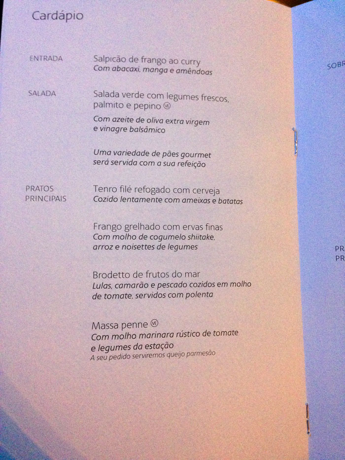 A experiência de vôo foi bastante similar, entretanto a janta foi servida em duas etapas: primeiro a entrada com a salada e em seguida o prato principal. Achamos que a comida estava bem mais gostosa na volta do que na ida.