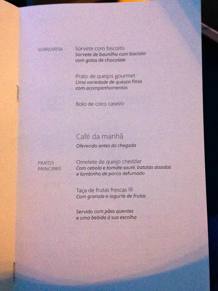 A janta foi servida de forma única. Entrada, salada e prato principal vieram todos em uma só bandeja, com pratos de louça e talheres de verdade. A sobremesa veio logo em seguida, com opções entre um bolo de côco, prato de queijos ou sorvete. Escolhemos o brodeto de frutos do mar com polenta e a carne com molho de cerveja. As sobremesas foram o sorvete e o prato de queijos. A comida estava gostosa, especialmente em se tratando de comida de avião. Cerca de uma hora antes do pouso foi servido o café da manhã. Optamos pelo omelete e estava bastante gostoso.