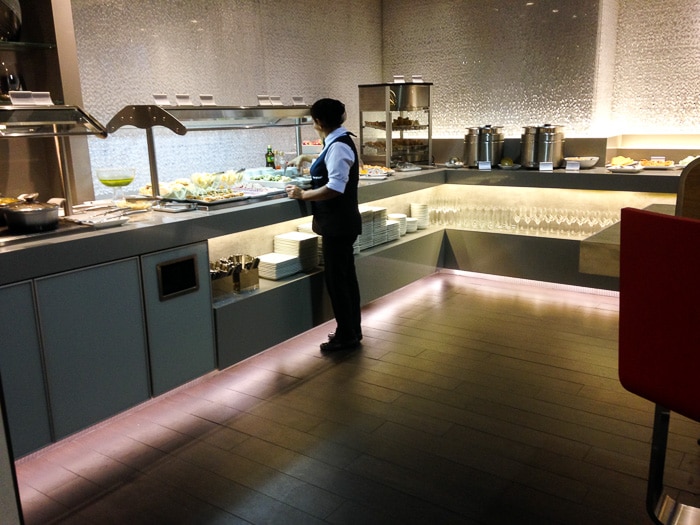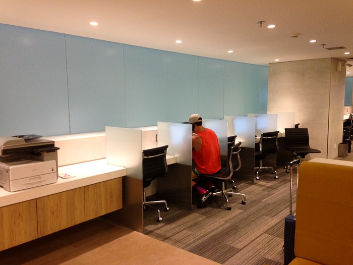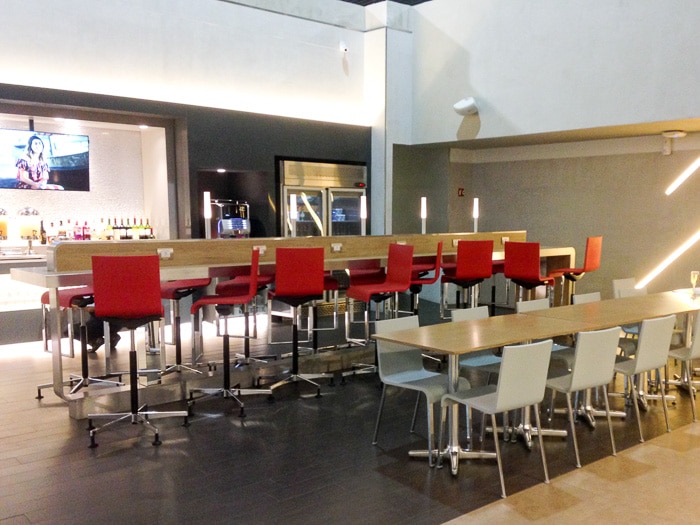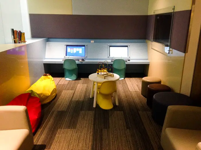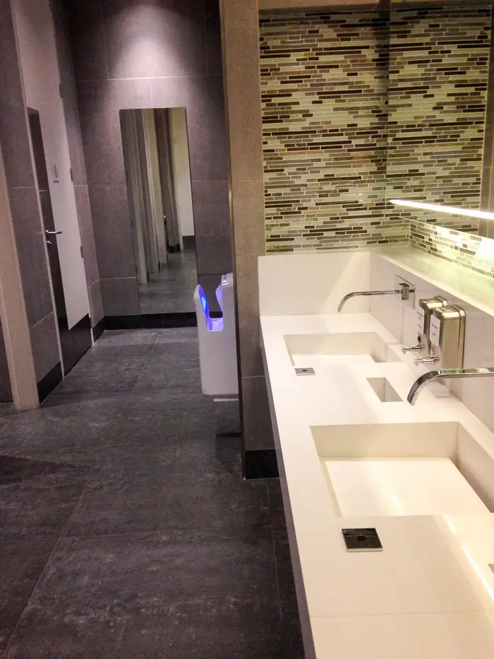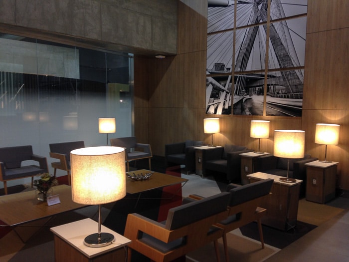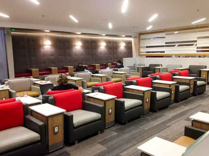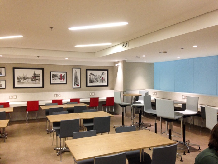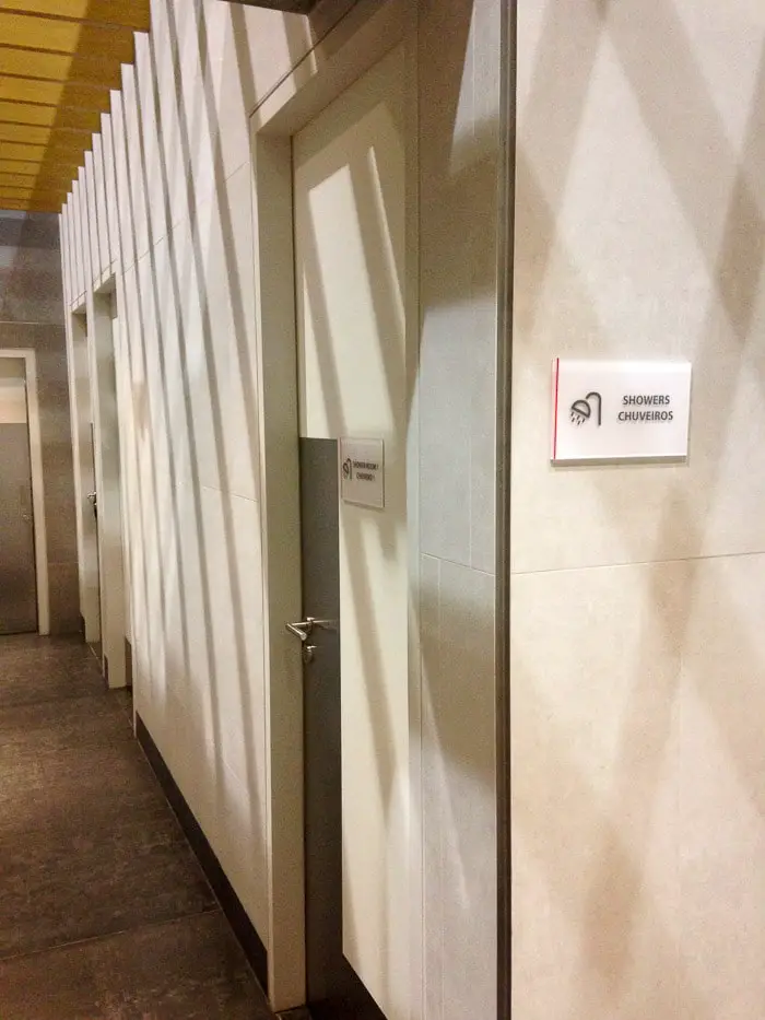 Mais uma vez valeu a pena esperar o embarque lá. A área é bastante confortável, com vários ambientes, um bufê variado e com opções bastante boas. Estão a disposição chuveiros, mas não usamos.